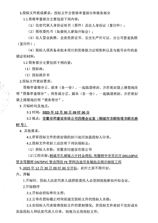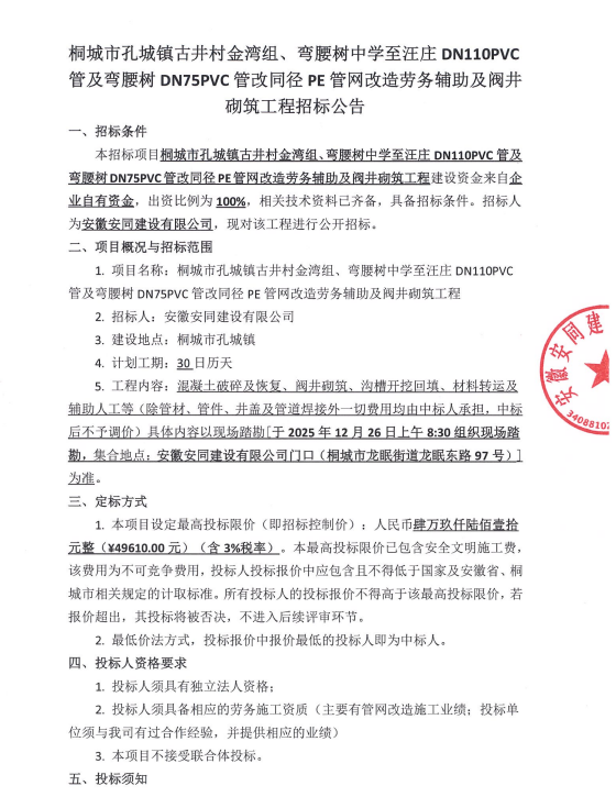 桐都会孔城镇古井村金湾组、弯腰树中学至汪庄DN110PVC管及弯腰树DN75PVC管改同径PE管网刷新劳务辅助及阀井砌筑工程招标通告