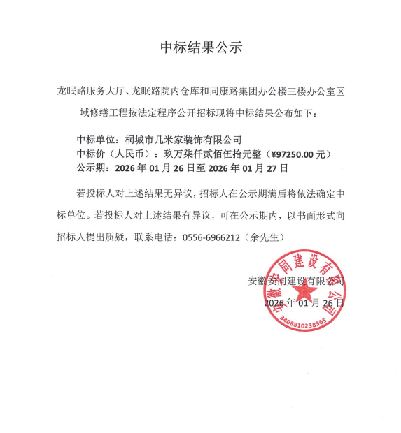 龙眠路效劳大厅、龙眠路院内客栈和同康路集团办公楼三楼办公室区域修缮工程中标效果公示