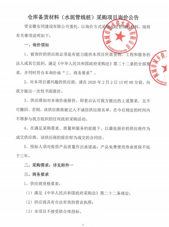 客栈备货质料(水泥管线桩)采购项目询价通告