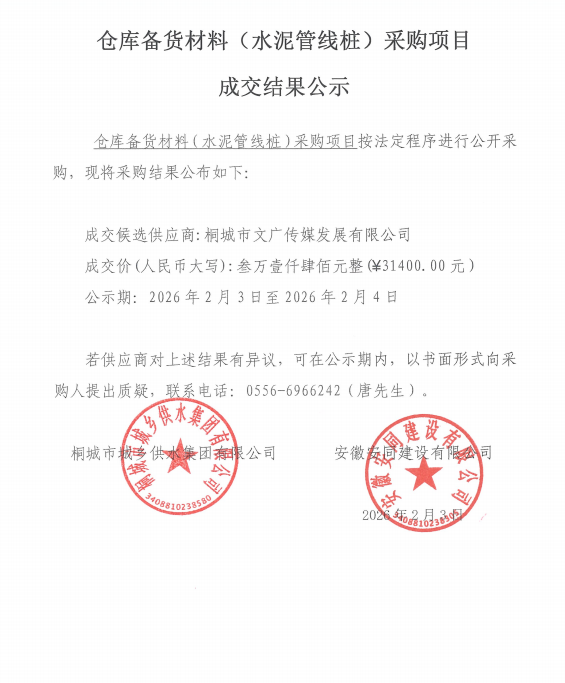 客栈备货质料(水泥管线桩)采购项目成交效果公示