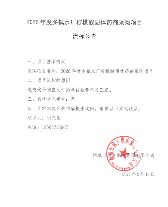 2026年度州里水厂柠檬酸固体药剂采购项目流标通告