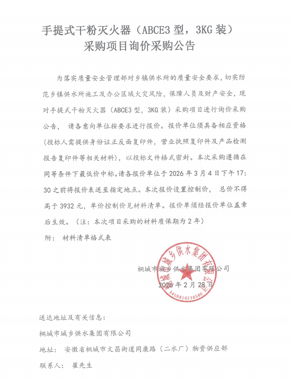 手提式干粉灭火器(ABCE3型,,,,,,3KG装)采购项目询价采购通告