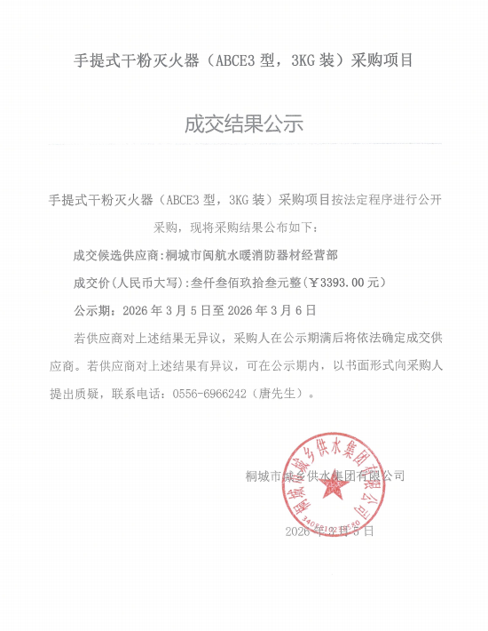 手提式干粉灭火器(ABCE3型 , ,,, ,,, ,3KG装)采购项目成交效果公示