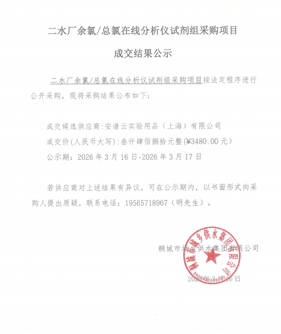 二水厂余氯/总氯在线剖析仪试剂组采购项目成交效果通告