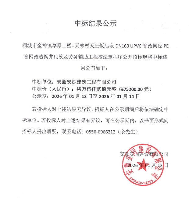 桐都会金神镇天林米业--天林村三岔路口段DN160、金鹿--高速桥段DN63 UPVC管改同径PE管网刷新阀井砌筑及劳务辅助工程 中标效果公示