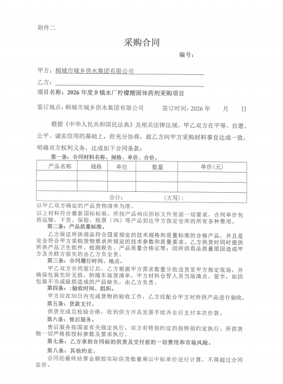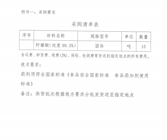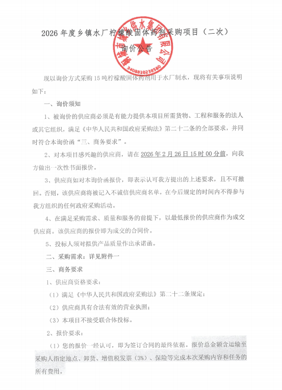 2026年度州里水厂柠檬酸固体药剂采购项目(二次)询价通告