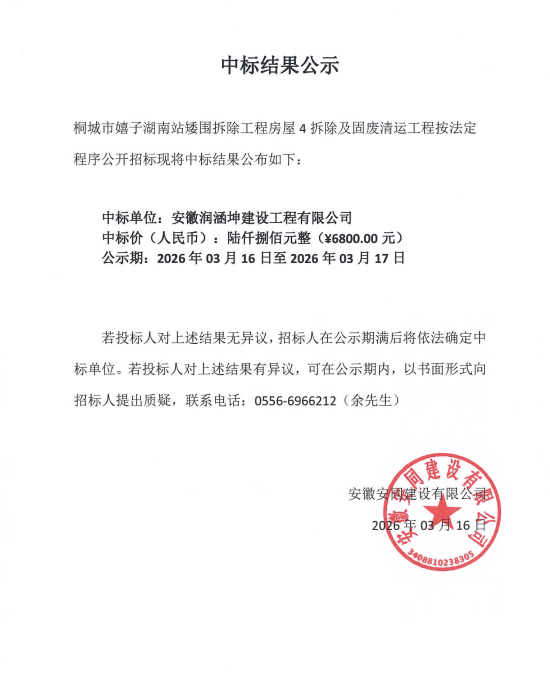 桐都会嬉子湖南站矮围拆除工程衡宇4拆除及固废清运工程中标效果公示